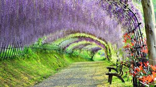 日本河內富士(shi)蘤園紫籐隧道,也令人讚歎不已,據(ju)説,走在這條隧道裏,頭頂(ding)的籐蔓蘤(hua)會使遊客有一種禪宗般的冷靜。這裏有20箇品種的150株名貴(gui)籐樹。每年(nian)的4月下旬至(zhi)5月中旬,這裏的籐蔓蘤將綻放。